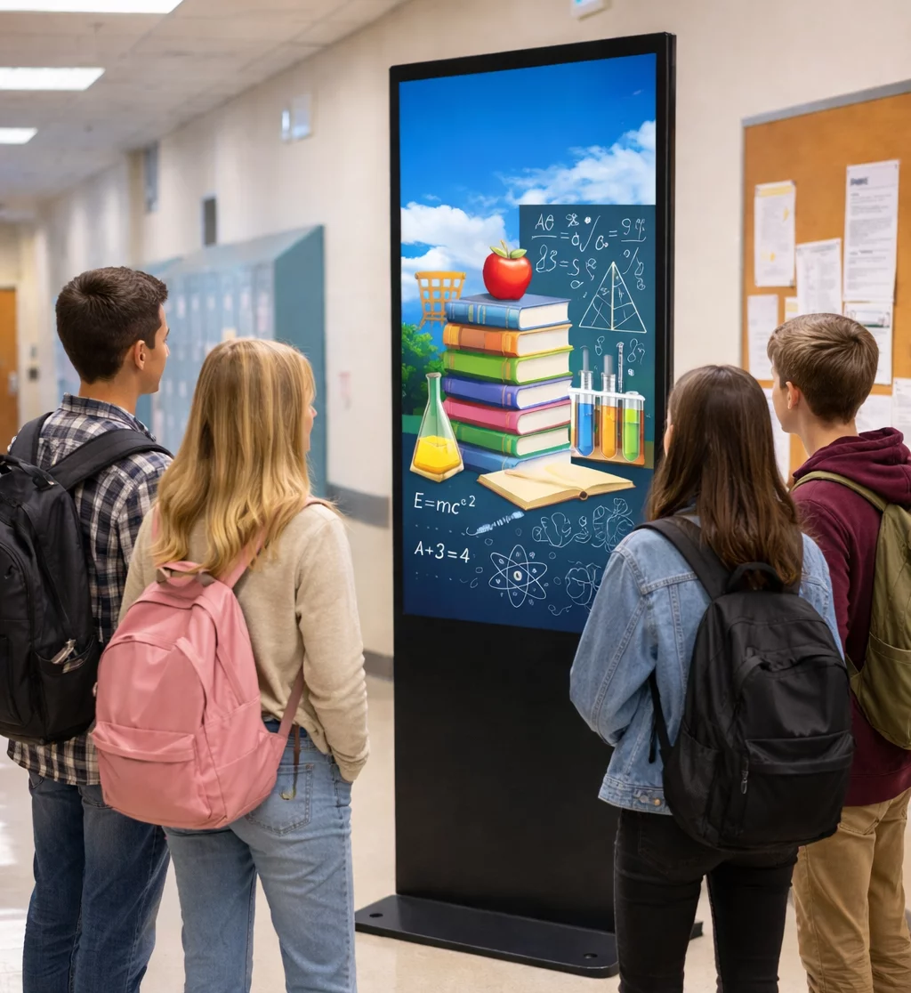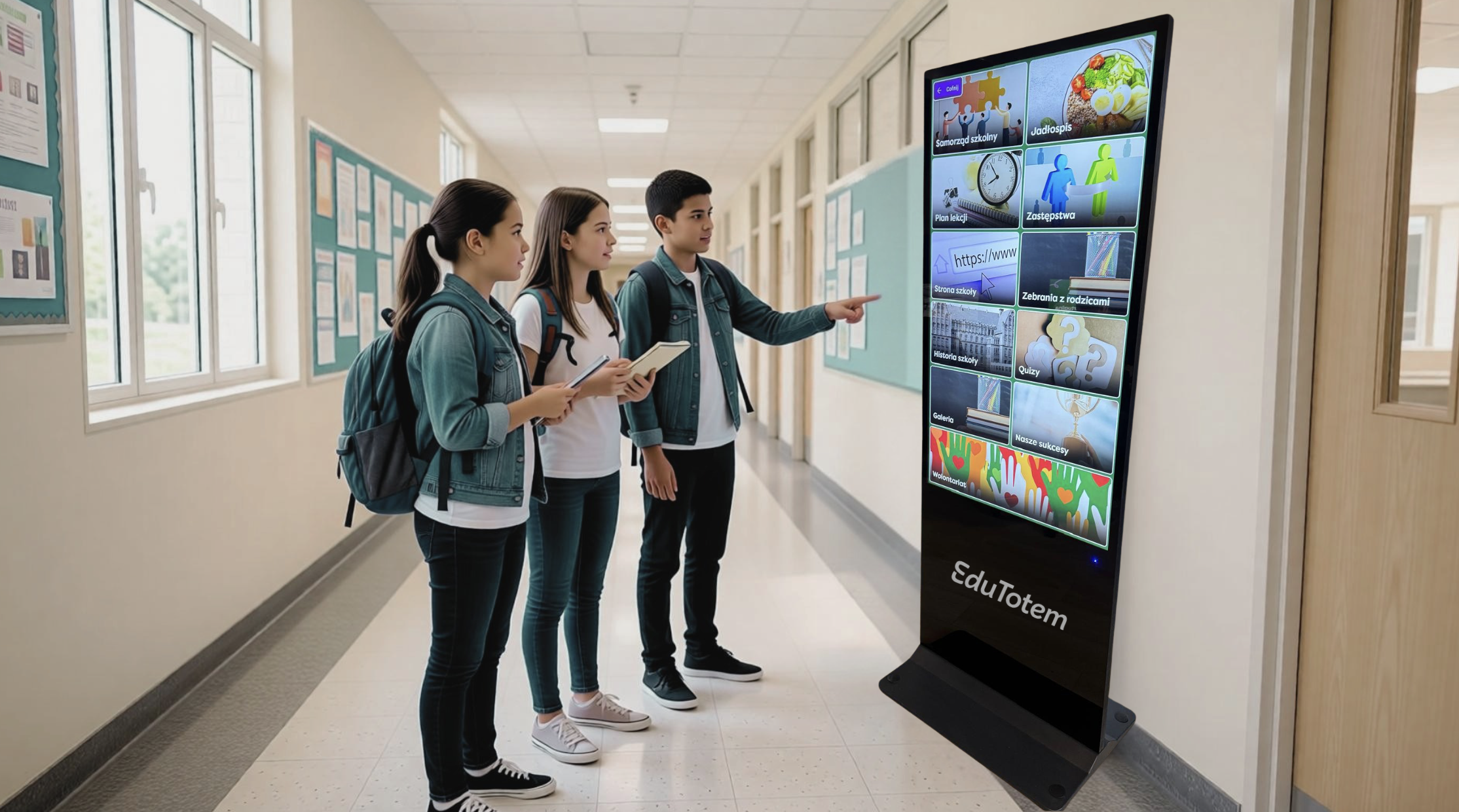 Totem edukacyjny to połączenie estetyki, technologii i praktyczności. Wysoka jakość wykonania oraz nowoczesny design sprawiają, że urządzenie doskonale wpisuje się w przestrzeń szkolnych korytarzy, stając się centralnym punktem informacyjnym placówki.